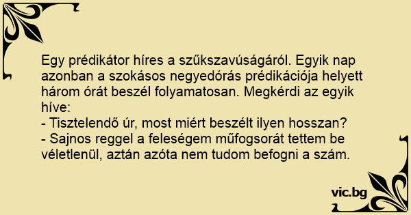 Egy prédikátor híres a szűkszavúságáról. Egyik nap azonban a szokásos negyedórás prédikációja helyett három órát beszél folyamatosan. Megkérdi az egyik híve: