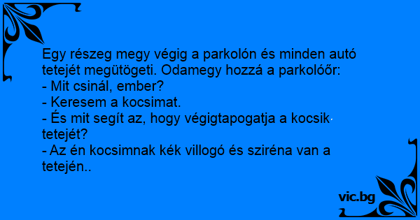 Egy részeg megy végig a parkolón és minden autó tetejét megütögeti. Odamegy hozzá a parkolóőr: