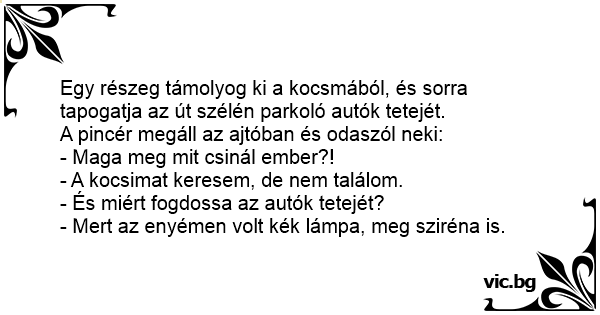 Egy részeg támolyog ki a kocsmából, és sorra tapogatja az út szélén parkoló autók tetejét.