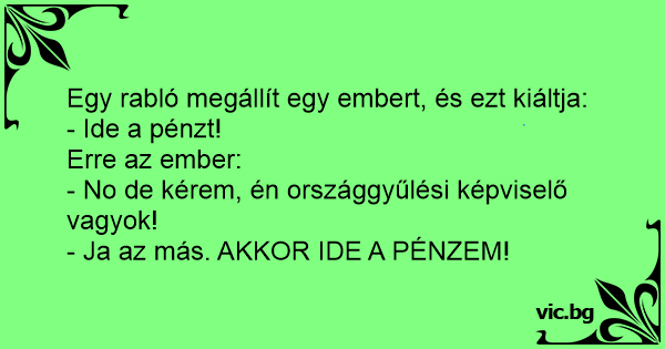 Пари Congressman's Money - Give me your money! - Това е обир, давай парите си! Грабитель на темной улочке останавливает одинокого пешехода: Late one night a mugger wearing a ski mask jumped into the path of a well-dressed man and stuck a gun in his ribs. Eines späten Abends in Berlin wird ein gut gekleidedter älterer Herr von einem maskierten Räuber überfallen: "Los, gib' mir all Dein Geld!" Empört gibt der ältere Herr zurück: "Das können Sie nicht machen! Ich bin Bundestagsabgeordneter!" "In diesem Falle", antwortet der Räuber, "gib mir MEIN... Un político se pierde en el camino. Entonces un ladrón se le acerca con una pistola y le grita: -¡Esto es un asalto, deme todo su dinero! -¿Pero acaso no sabe con quien se está metiendo? ¡Soy un político muy importante! -Ah...en ese caso, ¡devuélvame todo mi dinero! Dammi i tuoi soldi! Sono un politico Allora dammi i miei soldi Un ladrón coge a un hombre por la calle. - Deme todo su dinero. - Oiga, usted ni se imagina con quien está hablando. Soy un político muy influyente. El ladrón le mira y le dice: - En ese caso, devuelvame todo mi dinero. Um ladrão se aproxima de um senhor posudo e diz: — Me passe já o seu dinheiro. O senhor fica indignado e retruca, de dedo em riste: — O quê? O senhor sabe com quem está falando? Eu sou de-pu-ta-do!... O ladrão foi assaltar um político: - Passa o dinheiro! - Calma! Calma! Eu sou deputado. - Ah, nesse caso! Passa o MEU dinheiro. A thief walks up to a man in a suit and pulls out a gun. The Thief says: “Give me your money.” The man in the suit turns around surprised. He raises his hands and says: “But, wait! You can’t do... Un rapinatore va da una persona e dice: "Dammi i tuoi soldi!" Ma lui risponde: "Ma io sono un politico!" E il rapinatore risponde: "Allora dammi i miei soldi!". Egy rabló pisztollyal megy az utcán. Meglát egy öltönyös gazdag embert ahogy kiszáll a BMW-ből. - Ez biztos nagyon gazdag.- gondolja. Odamegy a pisztollyal és elkiáltja magát! - Add ide a pénzed! -... Un ladrón a punta de pistola, se cruza con un tipo: - ¡Deme todo su dinero!. El hombre se sorprende, pero en lugar de asustarse lo increpa: - Oiga, usted no sabe con quién se está metiendo. Soy un... - ¡Esto es un asalto, déme todo su dinero! - ¿Usted no sabe que yo soy político? - Disculpe, entonces ... ¡déme todo mi dinero! Presretne pljačkaš sa fantomkom na glavi uglađenog gospodina u novom odelu: - Daj mi tvoje pare, odmah! Uplašeni gospodin diže ruke uplašen i kaže: - Ali, ja.. Ja sam političar. - A jel', onda mi...