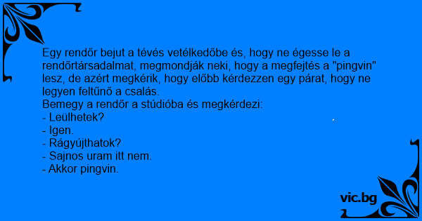 Egy rendőr bejut a tévés vetélkedőbe és, hogy ne égesse le a rendőrtársadalmat, megmondják neki, hogy a megfejtés a "pingvin" lesz, de azért megkérik, hogy előbb kérdezzen egy párat, hogy ne legyen feltűnő a csalás.