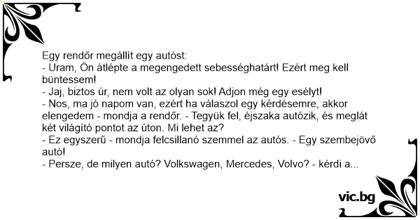 - Persze, de milyen autó? Volkswagen, Mercedes, Volvo? - kérdi a rendőr. - Sajnos nem sikerült, meg kell, hogy büntessem!