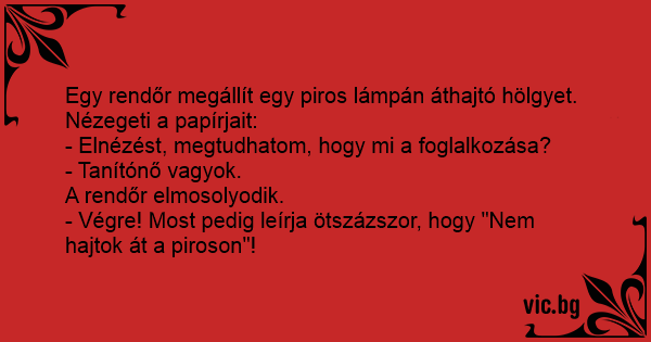 - Végre! Most pedig leírja ötszázszor, hogy "Nem hajtok át a piroson"!