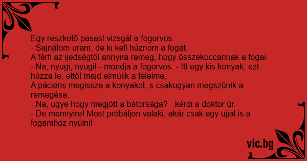 - Na, nyugi, nyugi! - mondja a fogorvos. - Itt egy kis konyak, ezt húzza le, ettől majd elmúlik a félelme.