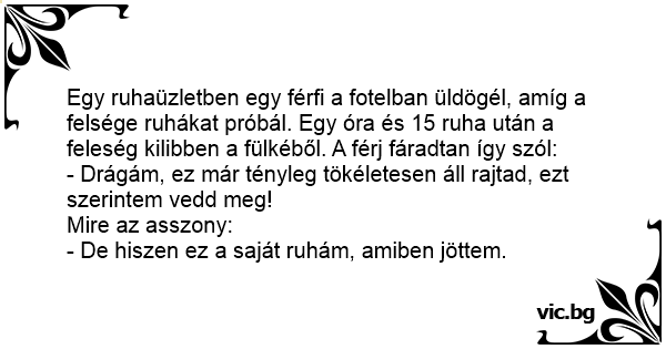 Egy ruhaüzletben egy férfi a fotelban üldögél, amíg a felsége ruhákat próbál. Egy óra és 15 ruha után a feleség kilibben a fülkéből. A férj fáradtan így szól: