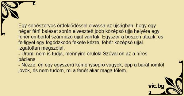 Egy sebészorvos érdeklődéssel olvassa az újságban, hogy egy néger férfi baleset során elvesztett jobb középső ujja helyére egy fehér embertől származó ujjat varrtak. Egyszer a buszon utazik, és felfigyel egy fogódzkodó fekete kézre, fehér középső ujjal.