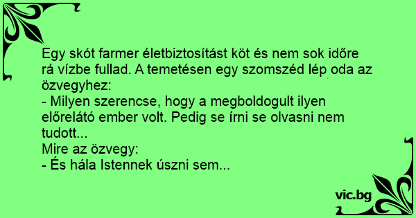 Egy skót farmer életbiztosítást köt és nem sok időre rá vízbe fullad. A temetésen egy szomszéd lép oda az özvegyhez: