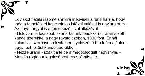 - Nézze uram! - szakítja félbe a megboldogult nagyanyja. - Mondja rögtön a legolcsóbbat, és számítsa le belőle, hogy a virágot és a halottat mi hozzuk!
