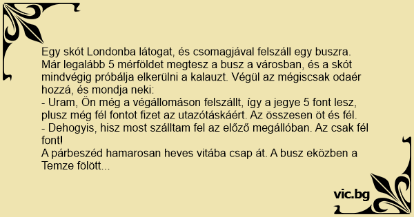 Egy skót Londonba látogat, és csomagjával felszáll egy buszra. Már legalább 5 mérföldet megtesz a busz a városban, és a skót mindvégig próbálja elkerülni a kalauzt. Végül az mégiscsak odaér hozzá, és mondja neki: