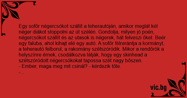 Egy sofőr négercsókot szállít a teherautóján, amikor meglát két néger diákot stoppolni az út szélén. Gondolja, milyen jó poén, négercsókot szállít és az utasok is négerek, hát felveszi őket. Beér egy faluba, ahol kihajt elé egy autó. A sofőr félrerántja a kormányt, a teherautó felborul, a rakomány szétszóródik. Mikor a rendőrök a helyszínre érnek, csodálkozva látják, hogy egy skinhead a szétszóródott négercsókokat tapossa szét nagy bőszen.