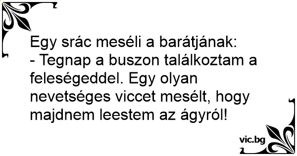 - Tegnap a buszon találkoztam a feleségeddel. Egy olyan nevetséges viccet mesélt, hogy majdnem leestem az ágyról!