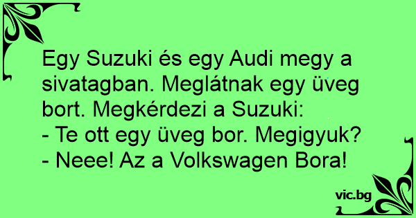 Egy Suzuki és egy Audi megy a sivatagban. Meglátnak egy üveg bort. Megkérdezi a Suzuki: