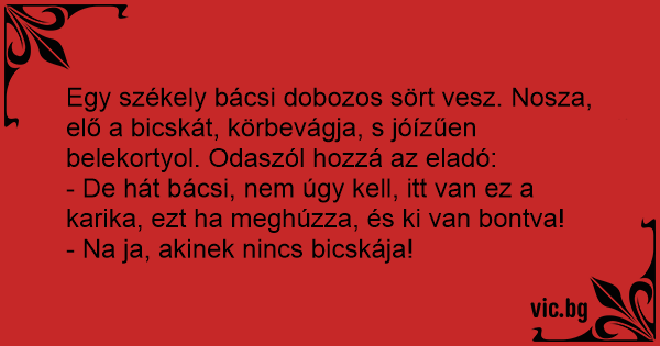 Egy székely bácsi dobozos sört vesz. Nosza, elő a bicskát, körbevágja, s jóízűen belekortyol. Odaszól hozzá az eladó: