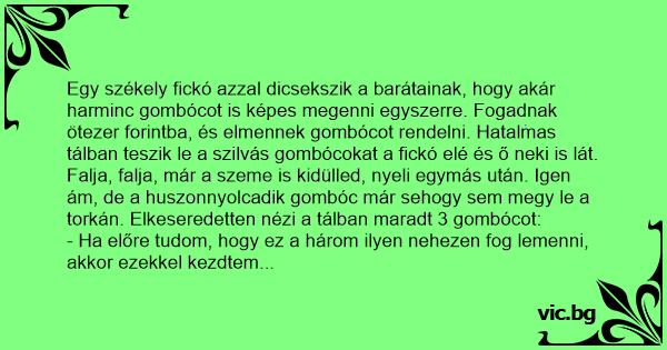 Egy székely fickó azzal dicsekszik a barátainak, hogy akár harminc gombócot is képes megenni egyszerre. Fogadnak ötezer forintba, és elmennek gombócot rendelni. Hatalmas tálban teszik le a szilvás gombócokat a fickó elé és ő neki is lát. Falja, falja, már a szeme is kidülled, nyeli egymás után. Igen ám, de a huszonnyolcadik gombóc már sehogy sem megy le a torkán. Elkeseredetten nézi a tálban maradt 3 gombócot: