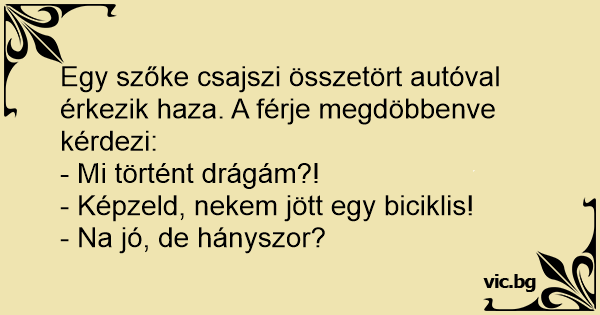 Egy szőke csajszi összetört autóval érkezik haza. A férje megdöbbenve kérdezi:
