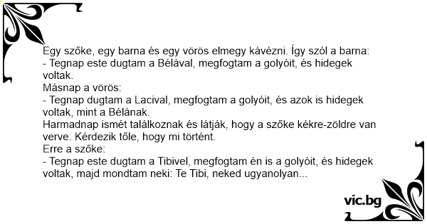 - Tegnap este dugtam a Tibivel, megfogtam én is a golyóit, és hidegek voltak, majd mondtam neki: Te Tibi, neked ugyanolyan hidegek a golyóid, mint a Bélának meg a Lacinak.