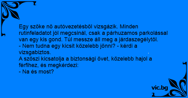- Nem tudna egy kicsit közelebb jönni? - kérdi a vizsgabiztos.