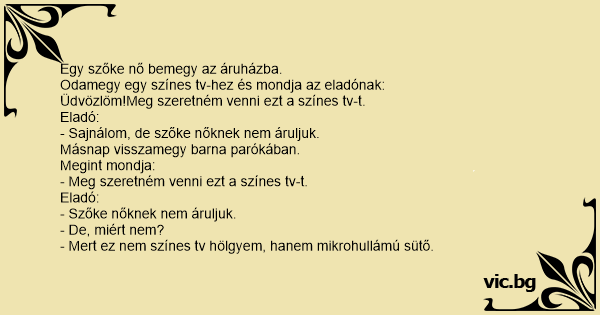 Szőke nő bemegy az Electro Worldbe. Rámutat egy tévére: - Az ott mennyibe kerül? - Sajnálom, de szőkekt nem szolgálunk ki. Megharagszik a nő, bemegy a fodrászhoz, átfesteti a haját barnára....