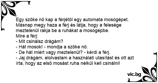 - Jaj drágám, elolvastam a használati utasítást és ott azt írta, hogy az első mosást ruha nélkül kell csinálni!