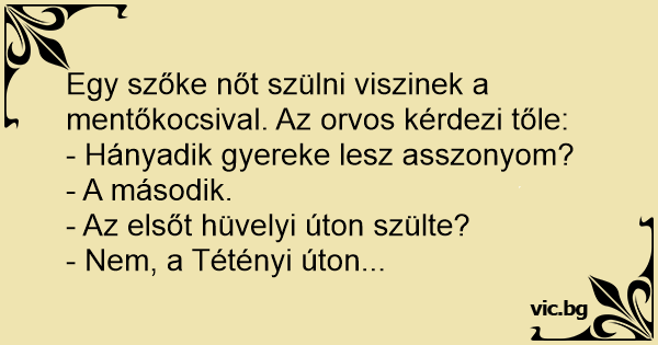 Egy szőke nőt szülni viszinek a mentőkocsival. Az orvos kérdezi tőle: