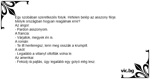 Egy szobában szeretkezés folyik. Hirtelen belép az asszony férje.