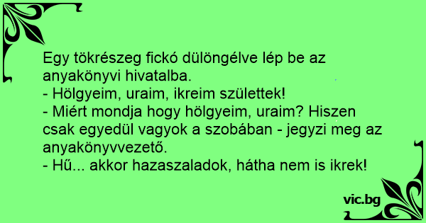 - Miért mondja hogy hölgyeim, uraim? Hiszen csak egyedül vagyok a szobában - jegyzi meg az anyakönyvvezető.
