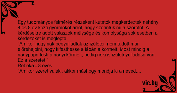 Egy tudományos felmérés részeként kutatók megkérdeztek néhány 4 és 8 év közti gyermeket arról, hogy szerintük mi a szeretet. A kérdésekre adott válaszok mélysége és komolysága sok esetben a kérdezőket is meglepte: