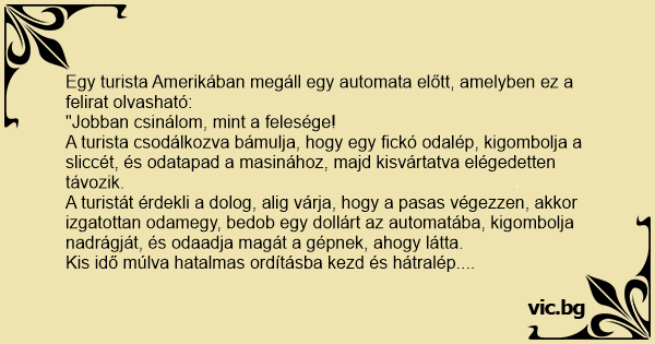 A turistát érdekli a dolog, alig várja, hogy a pasas végezzen, akkor izgatottan odamegy, bedob egy dollárt az automatába, kigombolja nadrágját, és odaadja magát a gépnek, ahogy látta.