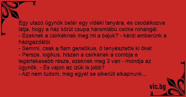 - Persze, logikus, hiszen a csirkének a combja a legértékesebb része, ezeknek meg 3 van - mondja az ügynök. - És vajon az ízük is jobb?