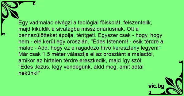 Egy vadmalac elvégzi a teológiai főiskolát, felszentelik, majd kiküldik a sivatagba misszionáriusnak. Ott a bennszülötteket ápolja, térítgeti. Egyszer csak - hogy, hogy nem - elé kerül egy oroszlán. "Édes Istenem! - esik térdre a malac - Add, hogy ez a ragadozó hívő keresztény legyen!"