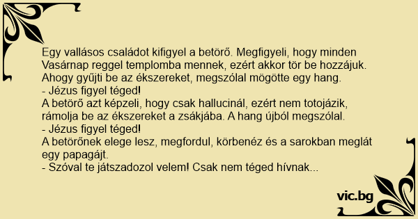Jesus sieht dich auch komischer Name Η απόκοσμη φωνή Ο συναγερμός Ωραία ονόματα Πρόσεχε... Ο Θεός σε βλέπει! Ο Ιησούς Крадец влязал в къща да краде. Там имало папагал крадецът почнал да рови и папагалат казал: Вор залезает в дом, а там - попугай. Ein Einbrecher steigt in ein leeres Haus ein. Im ersten Stock hört er auf einmal eine Stimme: Late one night, a burglar broke into a house that he thought was empty. A man was robbing a house in the middle of the night. All of a sudden, he heard a parrot cry out. "Jesus is gonna get you." The robber ignored it, and takes the TV. Again, the parrot cries out. "Jesus is gonna get you." The robber started to get a little worried. "What's your name, birdie?"... Un voleur s'introduit un soir dans une maison et pendant qu'il est en train de cambrioler tout ce qu'il peut il entend une petite voix derrière lui qui lui dis: -Prends garde Jésus te voit ! Il se retourne mais ne remarque rien. Puis une deuxième fois la voix l'interpelle: - Attention. Jésus te... Un ladrón entra a robar en una casa y de pronto, escucha una voz que dice: Jesús te esta mirando el ladra se detiene.luego como no hollé nada continua.y de nuevo la vos dice: Jesús te esta mirando,el ladro asustado prende la luz y ve que esa vos viene de un loro que estaba en una jaula,y el... Un ladro entra in un appartamento buio, ma fatti due passi sente una voce: "Attento! Gesu' ti vede e ti sta giudicando!". Terrorizzato resta immobile, ma dopo pochi secondi la voce continua: "Attento! Gesu' ti ha visto, ti ha giudicato ed ora ti punira' ". A quel punto il ladro accende la torcia... C'est l'histoire d'un type qui va cambrioler un appartement. Il est là avec sa lampe de poche en train de fouiller dans les tiroirs, lorsque tout à coup il entend un voix derrière lui: - "Jésus et Marie te regardent !" Surpris, le cambrioleur se retourne, et de nouveau la voix: - "Jésus et Marie... C'est un type qui se promène dans la rue, et accroché sur la porte d'une entrée d'un jardin, il voit : ATTENTION PERROQUET MéCHANT ! Et un peux plus loin dans le jardin, il aperçoit notre bête,... En inbrottstjuv hade bevakat en villa under en längre tid. En mörk kväll var han säker på att ägarna var borta och skred till verket. Väl inne i huset hör han en hes röst: - Jag ser dig allt,... Inbrottstjuven smög in i den mörka villan. Plötsligt hördes en röst: - Jag ser dig och det gör Jesus också! Tjuven tvärstannade, tog ett nytt försiktigt steg fram och igen hördes, - Jag ser dig... Ein Einbrecher steigt durch das Fenster in ein Haus als er eine Stimme hört: "Jesus sieht dich." Verwirrt blickt er sich um, sieht aber niemanden. Er beginnt wertvolle Gegenstände an sich zu... Een zekere nacht probeert een inbreker in een huis te breken en hoort opeens een stem die zegt: "Jezus ziet wat je doet." De inbreker springt op, kijkt rond en ziet niets. Hij gaat dus verder met... Een inbreker sluipt door een donkere huiskamer, op zoek naar buit. Plotseling hoort hij een stem "Jezus houdt u in de gaten". De inbreker schrikt zich een ongeluk en verstopt zich achter een... Hırsız, gecenin yarısında bir eve girer. Karanlık koridorda, yaktığı küçük el fenerinin ışığında ilerlerken bir ses duyar: - "İsa seni izliyor!" Şaşkınlık ve korkuyla etrafına bakınan hırsız,... O ladrão ia assaltar uma casa, quando viu na porta um cartaz: Cuidado com o papagaio! Ele entrou e viu o raio do papagaio. Chegou perto e disse: — É com isso aí que eu tenho que tomar cuidado? Já... Late one night a burglar broke into a house and while he was sneaking around he heard a voice say, "Jesús is watching you." He looked around and saw nothing. He kept on creeping and again heard,... O ladrão avança em silêncio pela casa. — Jesus está vendo você — diz uma voz. O ladrão se detém, apavorado. Olha ao redor, em desespero. Num canto escuro, vê uma gaiola com um papagaio dentro e... A burglar broke into a house one night. He shone his torch around, looking for valuables when a voice in the dark said, ‘Jesus knows you’re here.’ He nearly jumped out of his skin, clicked his... Ao adentrar em uma residência alheia o ladão escuta uma voz: "Jesus tá te olhando". O ladrão todo assustado continua o seu trabalho quando a voz fala de novo: "Jesus tá te olhando". Aparvorado o... A burglar crept into a huge, luxurious house one night. Shining his flashlight on the floor in the dark, he heard a voice saying, "Jesus is watching you." He looked around nervously, shook his... O ladrão vai roubar uma casa. Quando está desconectando o computador, ouve uma voz que falava assim: -Jesus está te olhando. Ele não ligou e cuntinuou roubando, quando ouviu a mezma voz dizendo... Det var en gång en tjuv som gjorde inbrott i en lyvilla, just som han hörde en röst: - Jesus ser dig! Då tittade tjuven sig om och såg en papegoja. - Jaså du kan prata? sa tjuven. Vad heter du,... Um ladrão entrou na casa de madrugada para obviamente para assaltar. Enquanto colocava as coisas dentro de um saco , uma voz falou: "Jesus está te olhando." O ladrão assustado olha para um lado,... Złodziej idzie obrabować mieszkanie. Nagle słyszy: - Jezus patrzy, Jezus patrzy. Idzie dalej i znowu słyszy: - Jezus patrzy, Jezus patrzy. Odwraca się i widzi papugę, która mówi: - Jezus patrzy.... Um ladrão pulou numa casa p roubar. Quando estava dentro de casa,escutou: -Jesus ta te vendo... Continuou.Depois escutou de novo: -Jesus tá te olhando... Aí o ladrão para e olha para o lado,e... Um ladrão, pulou o muro de uma casa e foi até a porta na intensão de arromba-lá, quando estava quase conseguindo,uma voz estranha o adverte: -Cuidado jesus esta vendo !!! Assustado ele olha para... Dois ladrões resolvem invadir uma casa e arrombam a porta de entrada. T