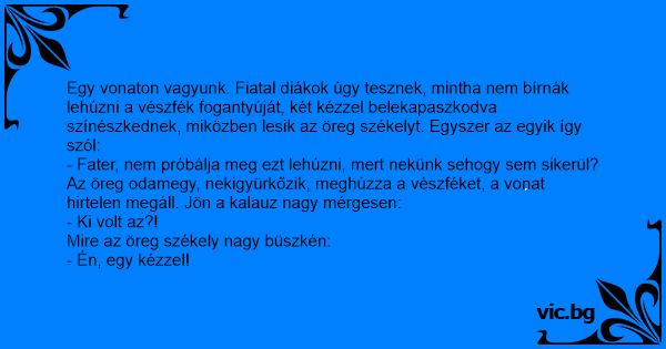 Egy vonaton vagyunk. Fiatal diákok úgy tesznek, mintha nem bírnák lehúzni a vészfék fogantyúját, két kézzel belekapaszkodva színészkednek, miközben lesik az öreg székelyt. Egyszer az egyik így szól:
