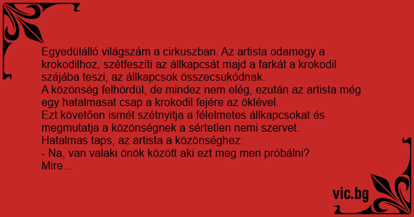 Egyedülálló világszám a cirkuszban. Az artista odamegy a krokodilhoz, szétfeszíti az állkapcsát majd a farkát a krokodil szájába teszi, az állkapcsok összecsukódnak.