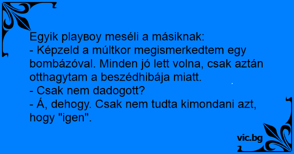 - Képzeld a múltkor megismerkedtem egy bombázóval. Minden jó lett volna, csak aztán otthagytam a beszédhibája miatt.