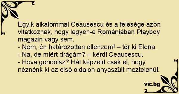 Egyik alkalommal Ceausescu és a felesége azon vitatkoznak, hogy legyen-e Romániában Рlаyвоy magazin vagy sem.