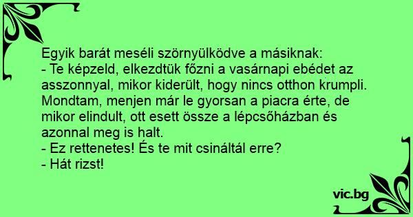 - Te képzeld, elkezdtük főzni a vasárnapi ebédet az asszonnyal, mikor kiderült, hogy nincs otthon krumpli. Mondtam, menjen már le gyorsan a piacra érte, de mikor elindult, ott esett össze a lépcsőházban és azonnal meg is halt.