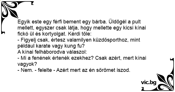 Egyik este egy férfi bement egy bárba. Üldögél a pult mellett, egyszer csak látja, hogy mellette egy kicsi kínai fickó ül és kortyolgat. Kérdi tőle: