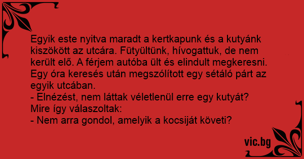 Egyik este nyitva maradt a kertkapunk és a kutyánk kiszökött az utcára. Fütyültünk, hívogattuk, de nem került elő. A férjem autóba ült és elindult megkeresni. Egy óra keresés után megszólított egy sétáló párt az egyik utcában.