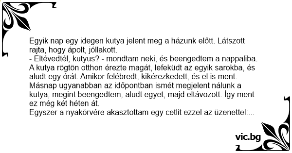 - Eltévedtél, kutyus? - mondtam neki, és beengedtem a nappaliba. A kutya rögtön otthon érezte magát, lefeküdt az egyik sarokba, és aludt egy órát. Amikor felébredt, kikérezkedett, és el is ment.