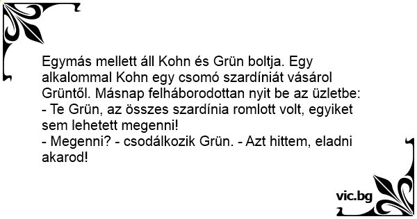 Egymás mellett áll Kohn és Grün boltja. Egy alkalommal Kohn egy csomó szardíniát vásárol Grüntől. Másnap felháborodottan nyit be az üzletbe: