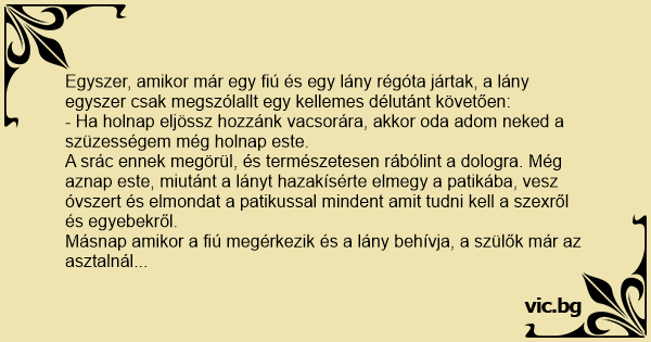- Ha holnap eljössz hozzánk vacsorára, akkor oda adom neked a szüzességem még holnap este.