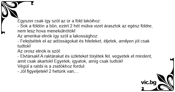 - Sok a földön a bűn, ezért 2 hét múlva vizet árasztok az egész földre, nem lesz hova menekülnötök!