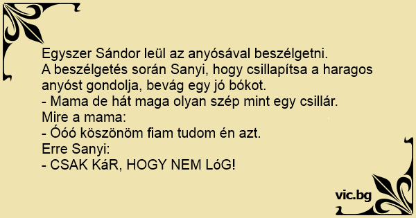 A beszélgetés során Sanyi, hogy csillapítsa a haragos anyóst gondolja, bevág egy jó bókot.