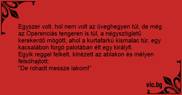 Egyszer volt, hol nem volt az üveghegyen túl, de még az Óperenciás tengeren is túl, a négyszögletű kerekerdő mögött, ahol a kurtafarkú kismalac túr, egy kacsalábon forgó palotában élt egy királyfi.