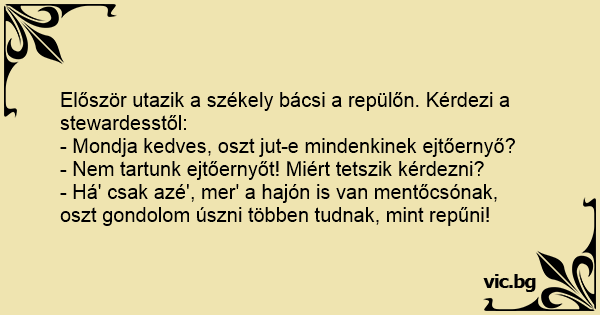 Először utazik a székely bácsi a repülőn. Kérdezi a stewardesstől: