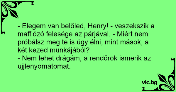 - Elegem van belőled, Henry! - veszekszik a maffiózó felesége az párjával. - Miért nem próbálsz meg te is úgy élni, mint mások, a két kezed munkájából?