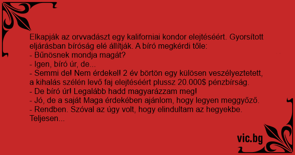Elkapják az orvvadászt egy kaliforniai kondor elejtéséért. Gyorsított eljárásban bíróság elé állítják. A bíró megkérdi tőle:
