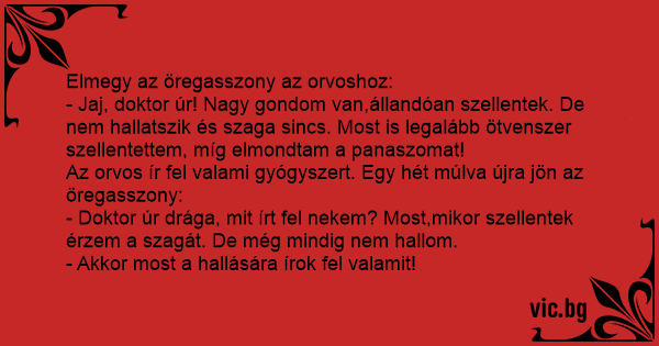 - Doktor úr drága, mit írt fel nekem? Most,mikor szellentek érzem a szagát. De még mindig nem hallom.