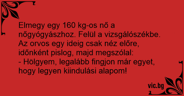 Elmegy egy 160 kg-os nő a nőgyógyászhoz. Felül a vizsgálószékbe. Az оrvos egy ideig csak néz előre, időnként pislog, majd megszólal: