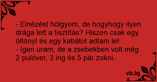 - Elnézést hölgyem, de hogyhogy ilyen drága lett a tisztítás? Hiszen csak egy öltönyt és egy kabátot adtam le!
